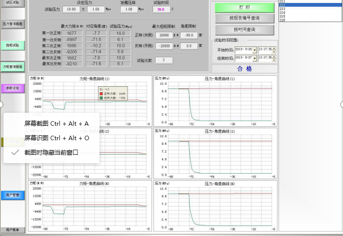 3、在進行閥門”啟閉扭矩測試”時,該裝置以液壓能為動力,液壓馬達產生可控可調的扭矩,通過扭矩傳感器和萬向節(jié)傳動桿,將扭矩傳至被測閥門,在被測閥門帶壓關閉或帶壓開啟時,啟閉閥門的扭矩由扭矩傳感器檢出信號,傳至“觸摸屏監(jiān)測系統(tǒng)”,系統(tǒng)實時地將檢測全過程的扭矩值,以曲線的形式,顯示和儲存在系統(tǒng)中,同時在系統(tǒng)中顯示最大的扭矩力,通過關鍵字,可檢索、查閱和打印扭矩檢測的數(shù)據(jù)和曲線。